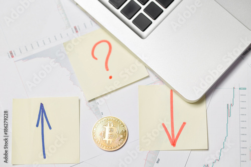 the rise or fall of a currency. coin bitcoin on the laptop keyboard. the concept of trading cryptocurrency.