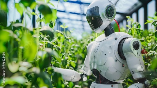 The robot examines the plants in the greenhouse