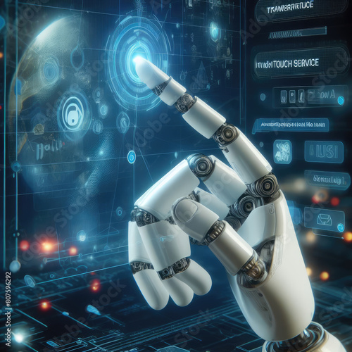 the robot is pointing at a transparent touch screen with Generative AI Techonology