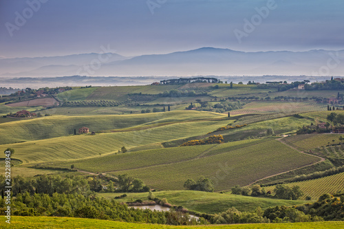 The rolling hills and green fields at sunrise in Tuscany. Tuscany landscape at sunrise in spring near the hilltop village Montepulciano, Tuscany, Italy
