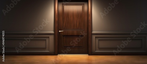 The room is dimly lit, showcasing a wooden door and floor with a design emphasizing brown wood grain color. with copy space image. Place for adding text or design