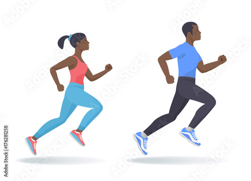 The running afroamerican people set. Side view of active sporty running young woman, man in a sportswear. Sport, jogging, fitness, workout, training concept. Flat vector illustration isolated on white