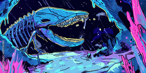 The Scarlet Whale's Domain: A dark and mysterious cave, adorned with eerie glowing algae and a massive skeleton looming overhead.