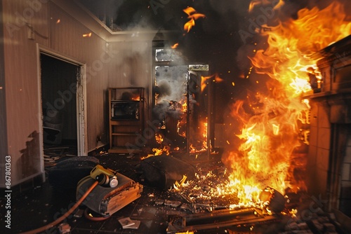 The scene shows flames engulfing the interior, with dense smoke filling the air