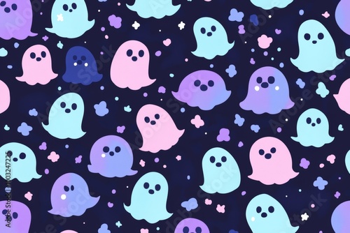 The seamless texture of Halloween ghosts, a tiling pattern, cute kawaii, dark background, blue color