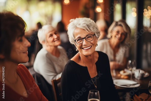 The senior Woman smiles and talks with a friend in the restaurant, Restaurant Reunion: Joyful Senior Smiles