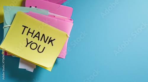 The sentence Thank you written by hand on a yellow post it and put on the white table