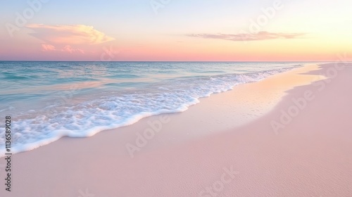 The serene solitude of an empty beach with smooth sand and gentle waves under a soft pink sunset creates a feeling of peace and tranquility.