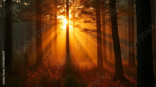 The setting sun casts a warm golden glow over the forest, with long shadows and atmospheric haze