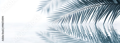 The shadows of tropical leaves on water surface. The shadows of palm leaves on white sand beach. Abstract background concept banner for a beach vacation.
