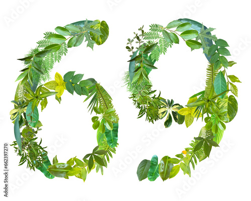 The shape of the number 69 is made of various kinds of leaves isolated on transparent background. suitable for birthday, anniversary and memorial day templates