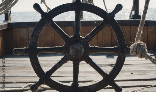 The ship's wheel sits on the deck of a boat as the ocean waves lap against the side