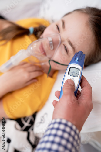 The sick girl inhales. High fever. She needs specialist medical care. Treatment of the child. Contagious disease treatment. Infectious illness concept.