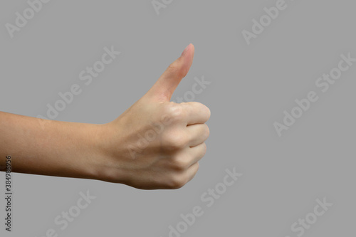 The sign of the thumb. Hand with white skin, showing the like sign, on a gray isolated background. Close-up, selective focus