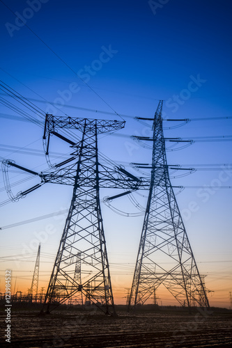 The silhouette of the evening electricity transmission pylon