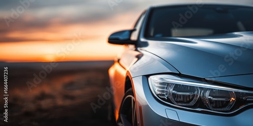 The Silver Sports Car Front Closeup at Sunset with Dramatic Warm Lighting
