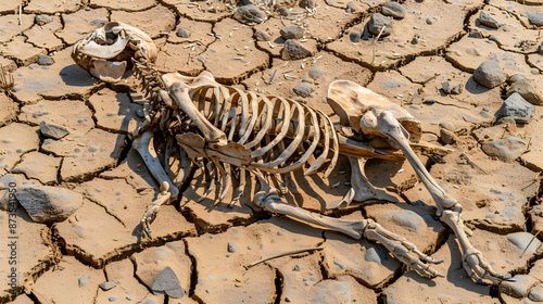 The skeletal remains of an animal lie on the cracked dried earth of a desolate drought affected landscape