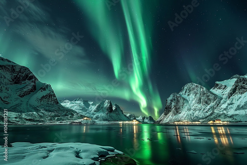 The sky comes alive with the northern lights, casting vibrant greens over a serene fjord surrounded by snow-capped mountains, reflecting beautifully on the water below