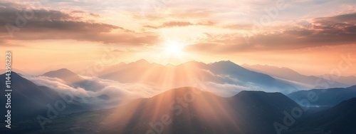 The sky is painted with the colors of dawn, as sunlight streams through the clouds.