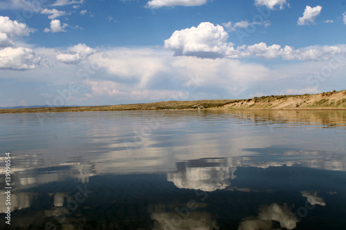 the sky reflected in the water, deserted beach lake, summer sky, nature, blue cloud,