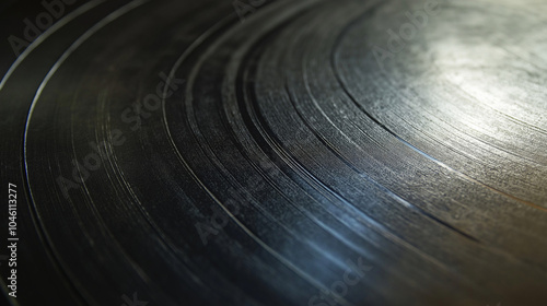 The smooth surface of a vintage vinyl record is highlighted,revealing its intricate grooves and deep texture as light reflects off it,evoking nostalgia,copy space