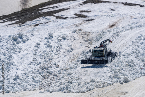 The snow tractor snowcat, snow groomer is ready for work, confidently standing against the backdrop of a snowy landscape, embodying power and reliability in winter conditions
