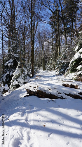 the snowy trail from the Unterer Felsenweg (lower rock path) to the Ritterplatte (knight plate), along the Battert, a panorama path in Baden-Baden in the region Baden-Wuerttemberg, Germany