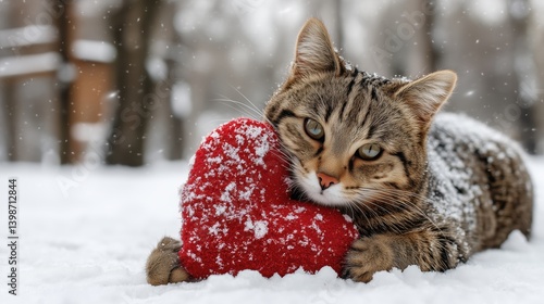 The soft fur and sparkling snow frame a tender moment, as the tabby cat clutches the frosty heart with pure affection.