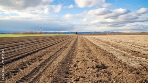 The spring plowed field is ready for the new season of sowing wheat, corn, sunflower, soybeans, and legumes. The ground against the background of trees and blue sky on a sunny day. Farm, Agricultural.