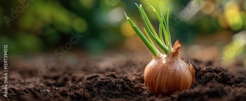 The sprouting onion bulb emerging from rich soil in a vibrant garden setting.