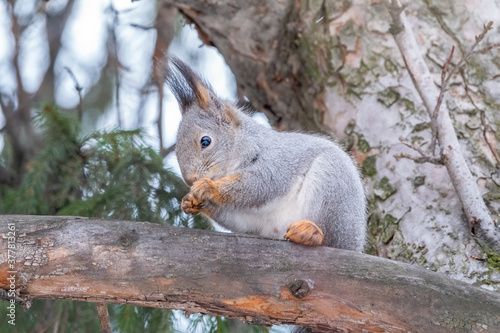 The squirrel sits on a fir branches in the winter or autumn.