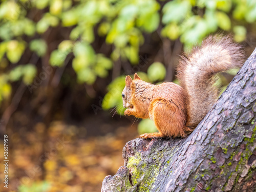 The squirrel with nut sits on tree in the autumn. Eurasian red squirrel, Sciurus vulgaris.