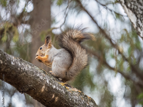 The squirrel with nut sits on tree in the autumn. Eurasian red squirrel, Sciurus vulgaris.