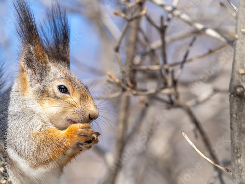 The squirrel with nut sits on tree in the winter or late autumn. Portrait of the squirrel close-up