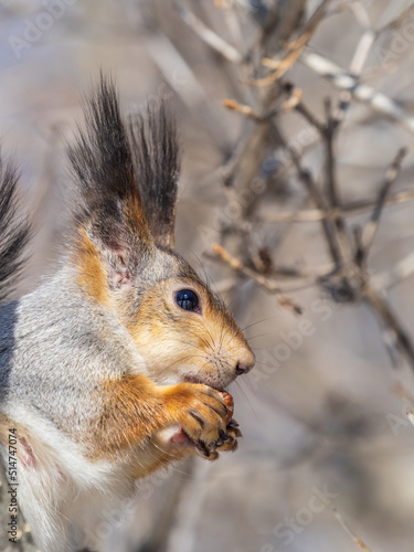 The squirrel with nut sits on tree in the winter or late autumn. Portrait of the squirrel close-up