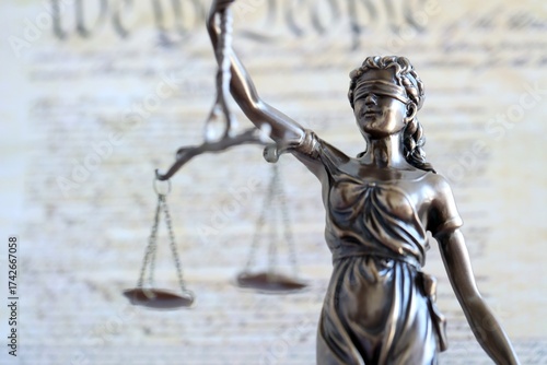 The statue of justice Themis, the blindfolded goddess of justice against US Constitution page