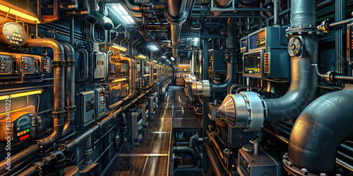 The Steel Labyrinth: A maze of industrial pipes, machines, and control panels in a dimly lit underground space