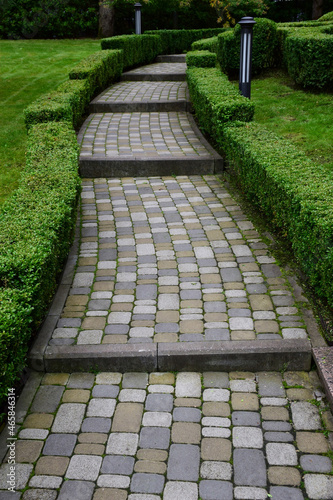 The stone-paved sidewalk meanders out into perspective between the hedge walls.