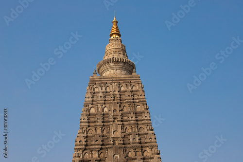 The stupa at Mahabodhi Temple Complex with blue sky in Bodh Gaya, India.