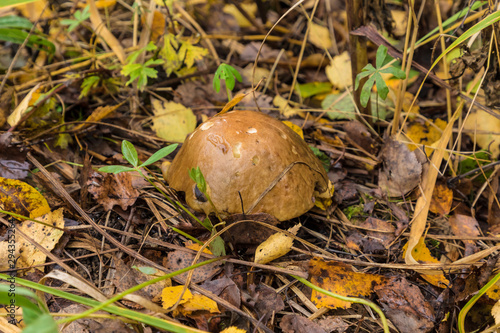 The summer or autumn forest landscape with white or birch mushroom or aspen among grass and fallen leaves