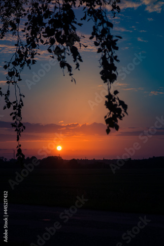 The summer sun rising behind the birch tree. Tree silhouette against the morning sky. Summertime scenery of Northern Europe.