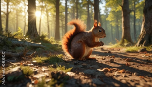 The sun casts long shadows across the forest floor as a squirrel forages for nuts, forest floor, shadow, trees