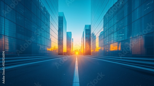 The sun sets between tall glass skyscrapers, casting warm reflections on a modern city street, highlighting urban beauty.