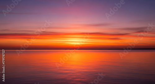 The sun sets over the ocean, painting the sky with vibrant hues of orange and purple, creating a serene and breathtaking scene