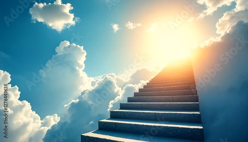 The sun shines brightly at the top of an endless stairway leading to heaven.