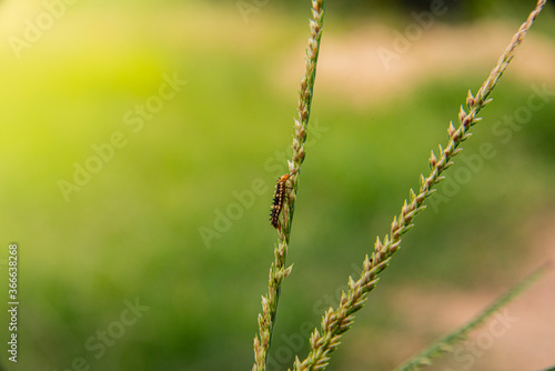 The sun shines on the caterpillar larvae , Blurry natural background.