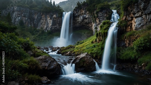 The surreal beauty of a cascading waterfall nestled within the heart of a rugged mountain range ai_generated