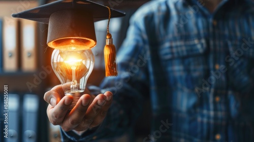 The symbolism of education and innovation depicted by a man holding a graduation cap on a light bulb