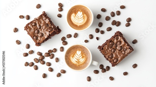 The table features three cups of coffee, accompanied by a pile of coffee beans and a piece of cake
