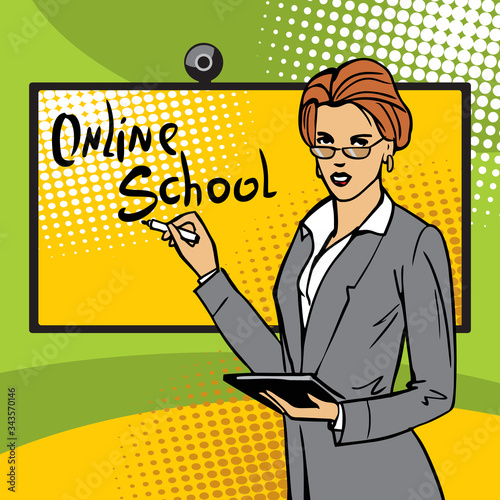 The teacher conducts an online lesson at school. Young woman business coach on computer monitor makes online training presentation. Business training on internet. Marketing strategy presentation